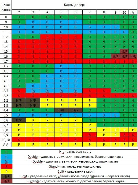 Пожалуйста, посмотрите внимательно в базовую таблицу раскладов. Здесь вы можете наблюдать, что каждый вариант уже давно просчитан и что если вы будете следовать данной таблице, то преимущество казино будет оцениваться всего лишь в ноль целых пять десятых перед вами, а данный показатель оказывается даже выше, чем при игре в рулетку, которая, традиционно, считается самой выгодной игрой против казино с наибольшими вероятностями выигрыша.